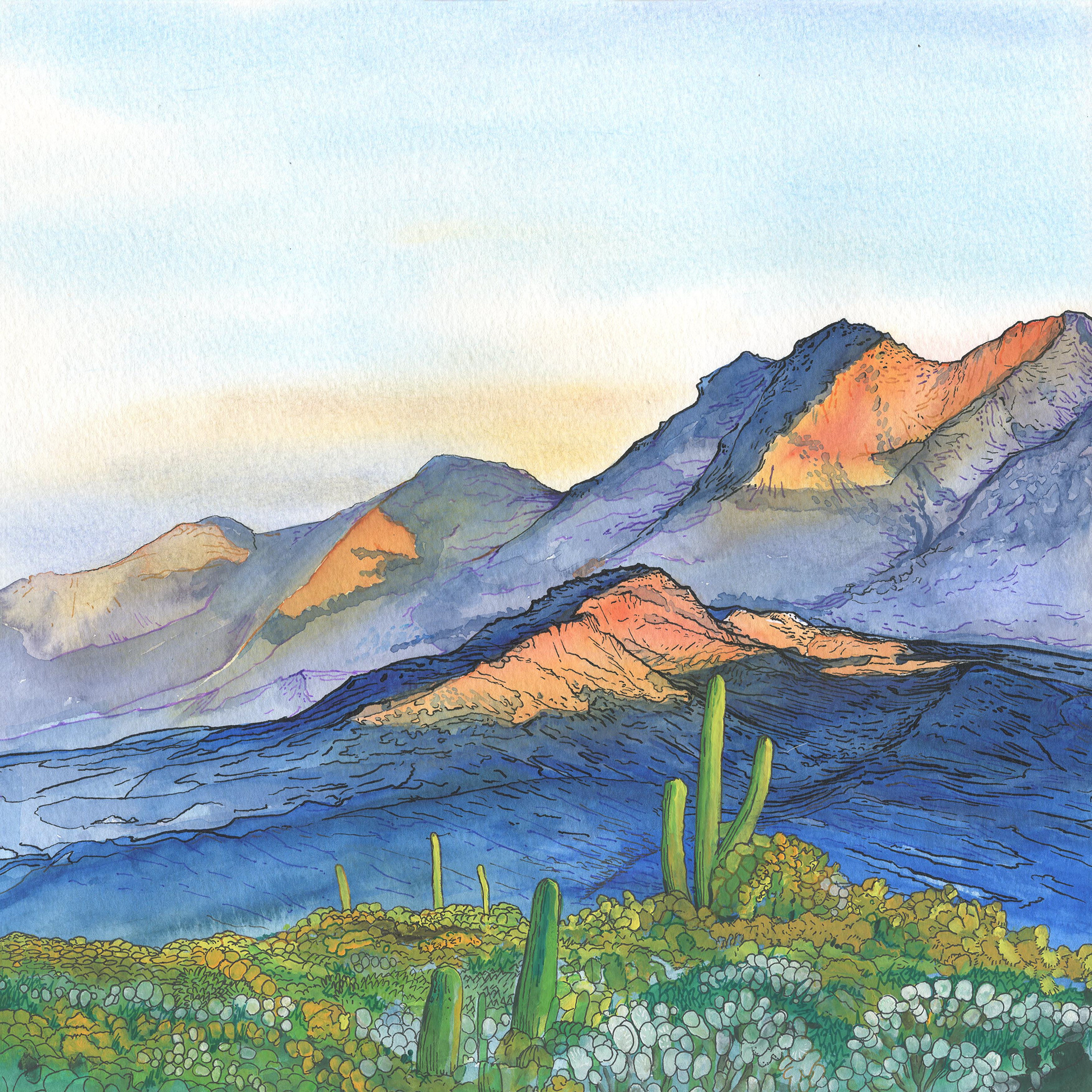 This is a commissioned piece of Growler Mountain in Tucson, created using watercolor, gouache, India ink, and soft pastel.